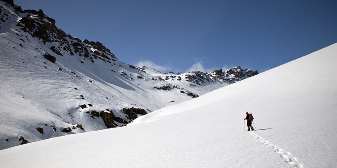 En burt séð frá því að daginn eftir fórum við svo á Birnudalstind, sem er fremst í Kálfafellsdal og skilur það frá Skálafellsjökli. Þangað er gengið inn Birnudalinn frá Staðardal. Þetta er mjög flott svona "mini-alpaleið" þar sem flottir tindar Kálfafellsfjallanna skaga uppúr landslaginu. Þetta var ágæt dagleið, og í þessu færi sem við vorum í var eins gott að við vorum á snjóþrúgum.