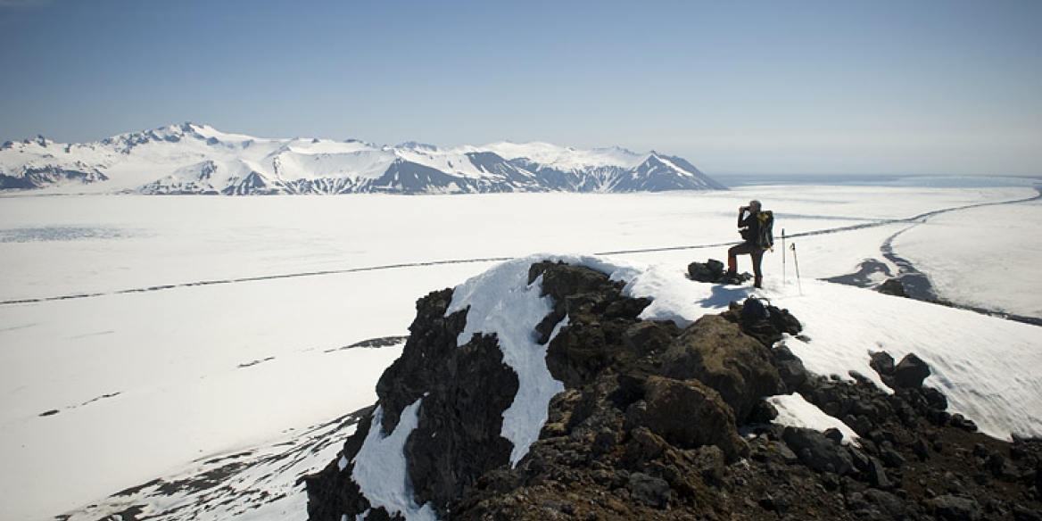 Á sunnudaginn var engin smá hiti og fórum við Þórhallur á Lyngbrekkutind á meðan Knútur og Raggi skelltu sér í sleðaferð á Öræfajökul og Mávabyggðir. Það var svo heitt hjá okkur að þó ég væri kominn úr að ofan lak þó af mér svitinn! Þegar á toppinn var komið lagðist ég niður í sólbað og slakaði aðeins á. Stuttu eftir að við lögðum af stað niður sáum við þá félaga koma til baka og voru þeir aðeins á undan okkur. Þegar við komum aftur niðrí skála höfðu þeir tekið út dýnurnar og látu þar eins og úlfaldar á nærbuxunum einum deyjandi úr hita! Við ákváðum að leggja okkur aðeins í hádegissólinni og kl. 15 ákváðum við Þórhallur að ganga niður Breiðamerkurjökulinn á skíðum á meðan þeir tóku dótið, keyrðu til baka og taka á móti okkur fyrir neðan jökulinn.