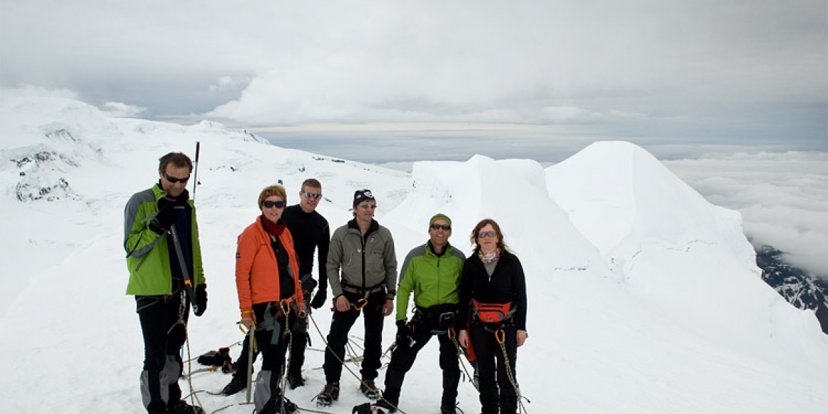 Við fórum frá bílastæðinu við Svínafellsjökul vestur fyrir Hafrafell, og þar upp hrygg sem leiðir inná jökulinn undir tindunum. Hópurinn stóð sig auðvitað mjög vel og byrjuðum við að fara á Vesturtind og fórum svo nokkur á Norðurtind, sem er hæstur. Brekkan niður af Vesturtindi verður alltaf brattari með árunum, en þegar ég prufaði að stinga snjóflóðastönginni í brekkuna fór hún nú ekki nema svona 50cm niður þannig að þetta er örugglega að verða komið. Jaðarsprungar var bara fín, ekkert mál að komast yfir hana, einnig sem lítið af sprungum sáust í Norðurtindi nema þessi eina stóra sem er yfirleitt sýnileg rétt undir toppnum.
