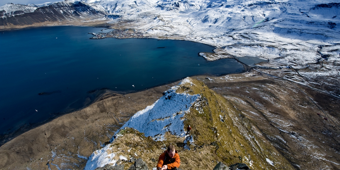 Aðstæðurnar voru bara þokkalegar, smá nýsnævi var í austurhlíðum og uppá topp sem var bara skemmtilega sleipt á köflum. Toppurinn var flottur og vorum að alveg að missa okkur í víðlinsuskotum þarna. Flott útsýni yfir Kvíabryggju og nágrenni. Nóg af fljúgandi rottum sem voru greinilega að undirbúa varp í klettunum og þóttum við ekki kærkominn félagsskapur.