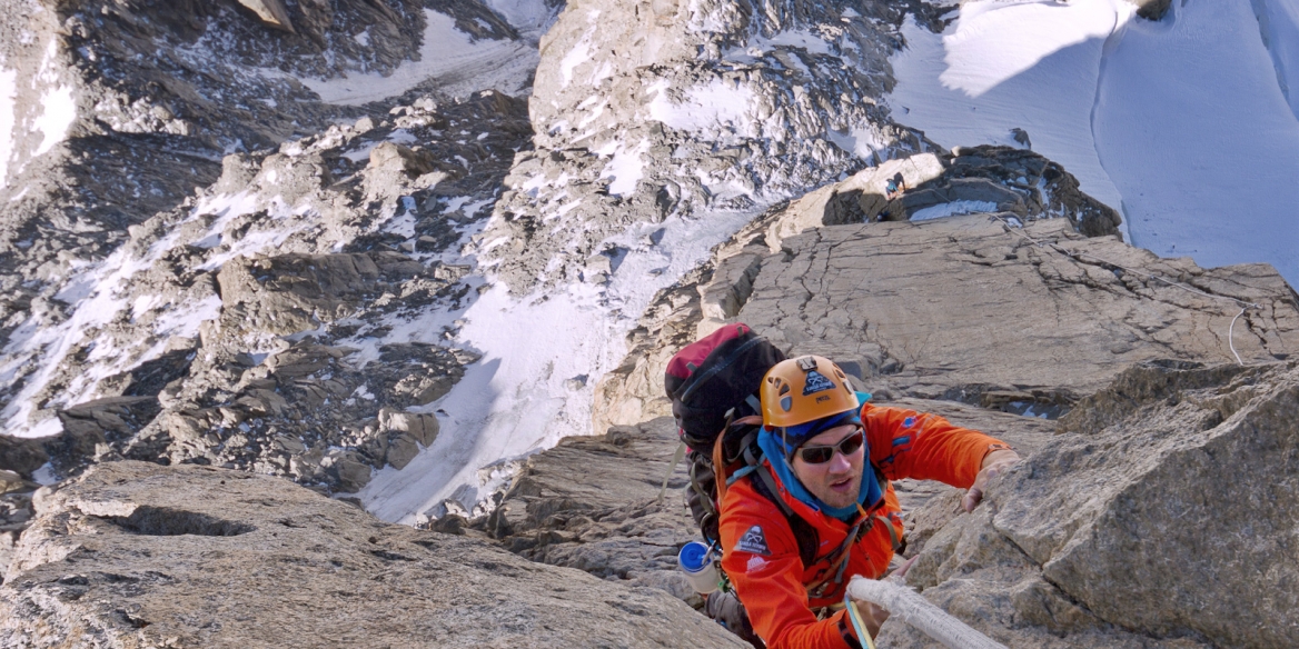 Eftir aðra spönn þar sem syllan er tekur við langt slab með alveg hreint ótrúlegu útsýni og exposure, þaðan kemur flott þröng rás sem leiðir mann svo á toppahrygginn. Ágætt að hafa fixuðu línuna þarna til að maður rataði örugglega réttu leiðina þrátt fyrir að lítil hætta sé á að villast þarna.