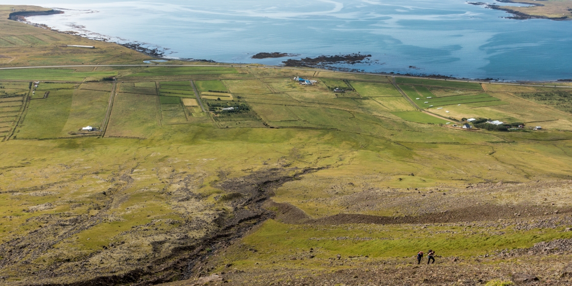Við þrömmuðum af stað þar sem einnig var farið að rökkva dáldið á okkur og vildum við helst ekki lenda í myrkri. Áköfin var svo mikil að við gengum heldur langt framhjá gilinu sem farið er niður sem tafði okkur dáldið og þurftum við að ganga til baka í rétt gil í þokunni.