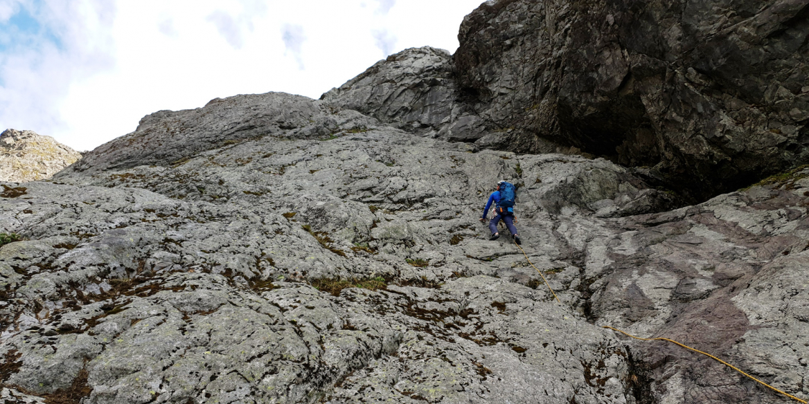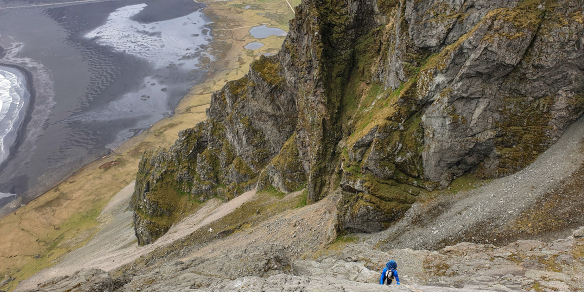 Það var því fyrirfram ákveðið að þegar Arnar og Bjartmar áttu smá frí inni og vildu nýta það í eitthvað spennandi að skella sér austur og klifra þessa mögnuðu leið þar sem veðurspáin lofaði góðu. Því var brunað alla leið austur á Höfn þar sem við horfðum á Ísland bursta Tyrki í undankeppni EM, það skyggði þó á aðeins á gleðina að það var ansi lágskýjað og spáin eitthvað að súrna, við héldum þó í vonina og þegar við vöknuðum daginn eftir tók við okkur heiðskýrt og flott veður. Við skelltum í okkur smá morgunmat og brunuðum að byrjun leiðarinnar þar sem við tókum okkur saman og þrykktum upp löngu grófu brekkuna upp Vestrahorn að byrjun klifurleiðarinnar í biluðum hita. Klifrið gekk vel og nokkuð hratt fyrir sig og náðum við toppnum í geggjuðu útsýni og frábæru veðri. Við höfum meðferðis tvo littla svifvængi sem við vonuðumst til að geta flogið af toppnum en þegar þangað var komið á braust sú von þar sem undirlagið var allt of gróft og bratt til að hægt væri að leggja niður vængina og fljúga niður svo við neyddumst til að síga niður og reyna að finna flugstaði eitthverstaðar á leiðinni niður. Það hafðist þegar við vorum komnir um þriðjung af leiðinni niður, en þá náðum því að stytta aðeins langa labbið niður með þægilegu glædi niður að bíl. Ánægðir með daginn tókum við okkur svo saman og brunuðum áleiðis í bæinn með næturstoppi á Kirkjubæjarklaustri.