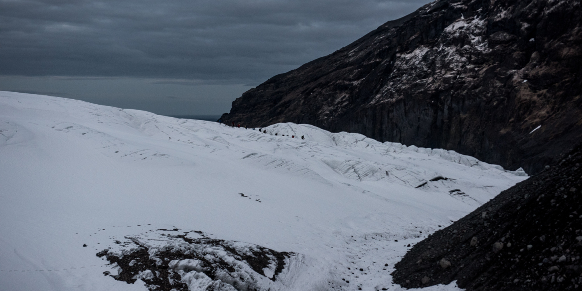 Við hófum gönguna kl. 2 aðfaranótt laugardagsins 16. maí við jökullónið við Virkis- og Falljökul eftir smá hvíld í Skaftafelli og byrjuðum á að ganga eftir sporðum þeirra í norður að Hvannadalshrygg. Við norðursporð Virkisjökuls er auðveld, smá lækkun af jöklinum að litlum dal sem leiðir upp að hryggnum. Flottir ísjakar blasa við á klettabrúnum Virkisjökuls þar sem reglulega hrynur úr honum. Allt gerir upplifunina skemmtilegri og viðburðarríkari en hefðbundna Sandfellsleiðin.