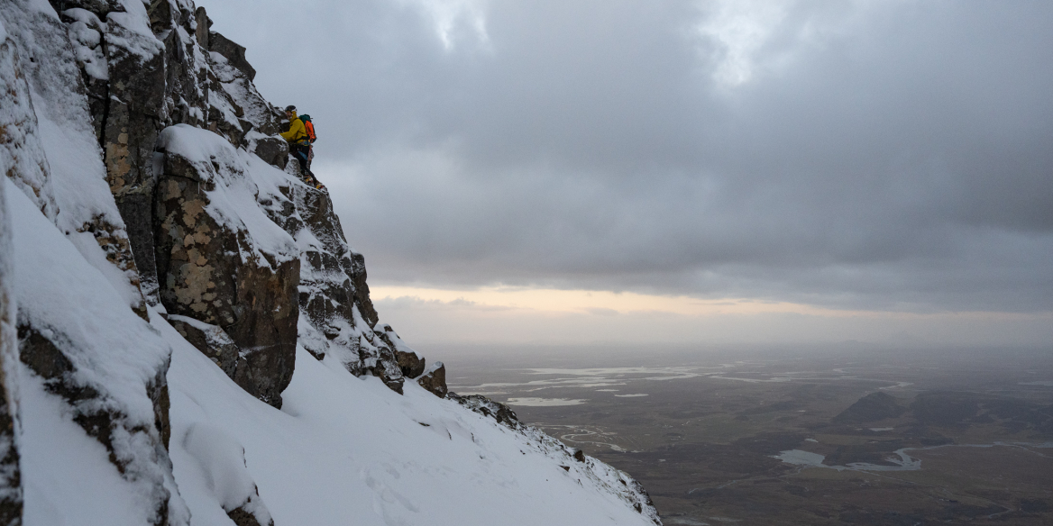 Það var talsverður vindur yfir daginn en við vorum þó í nokkuð góðu skjóli á hryggnum þar sem vindurinn kom að vestan. Þá fékk Gummi þá snjöllu hugmynd ofarlega í fjallinu að setja drónann í loftið til að taka myndir og sjá hvernig fjallið leit út. Um leið og hann kom upp fyrir fjallstoppinn fauk hann hreinlega upp í loftið þannig að þegar ég setti hann í sport mode og fulla ferð niður var hann samt að hækka sig um svona 1-2 metra á sekúndu, svo mikið var uppstreymið. Náði samt að fljúga honum út fyrir fjallið og ná þannig að lækka flugið og koma honum skjól megin til að fljúga að okkur aftur. Gummi fékk samt smá fiðring í magann og hélt á kafla að hann myndi einfaldlega fjúka eitthvað út í buskann.
